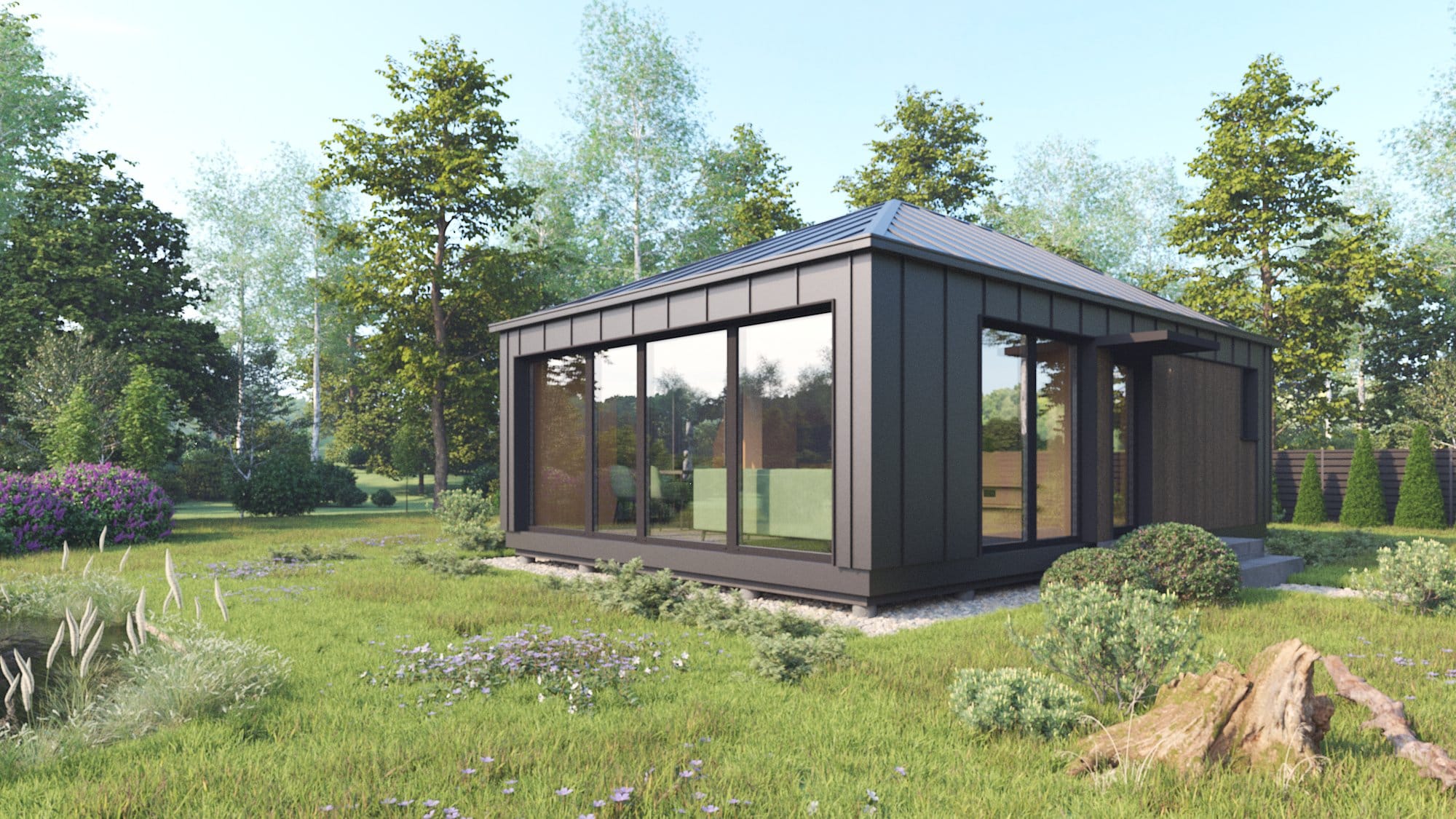 Modernus, kompaktiškas I gr. nesudėtingas statinys – karkasinė pirtis, vieno aukšto, 42m2 bendro ploto su daugiašlaičiu stogu. Numatytas funkcionalus išplanavimas: tambūras, priešpirtis, persirengimo patalpa su dušu, sanitarinis mazgas ir pirties patalpa.