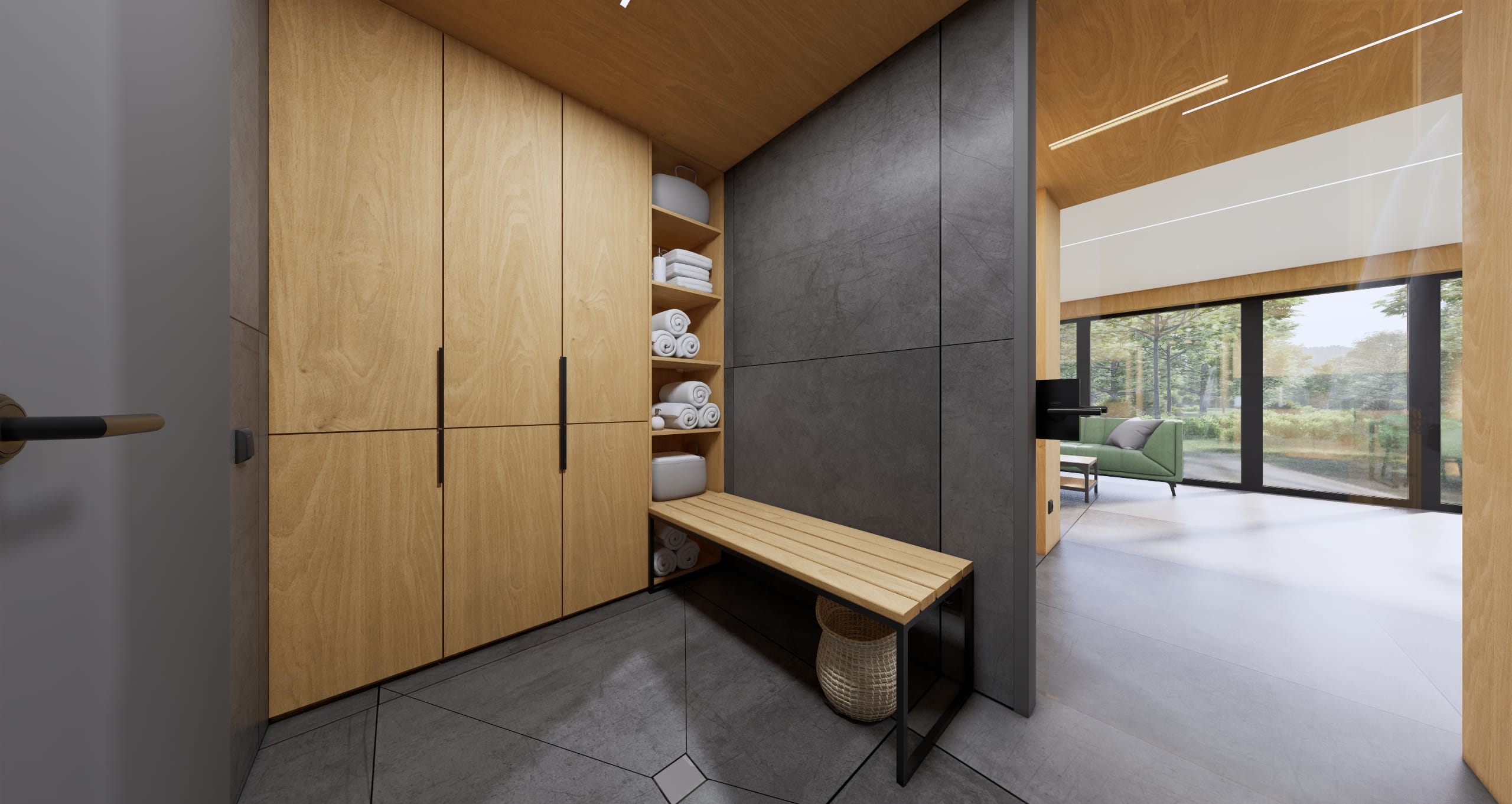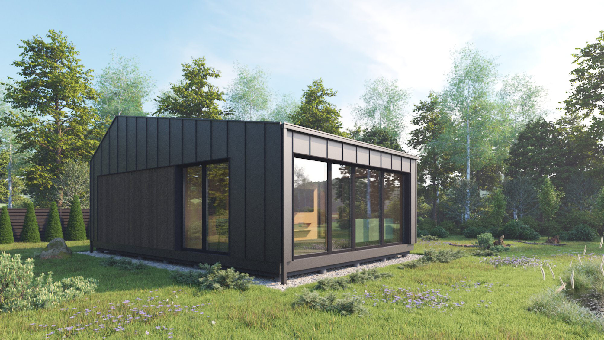 Modernus, kompaktiškas I gr. nesudėtingas statinys – karkasinė pirtis, vieno aukšto, 42m2 bendro ploto su dvišlaičiu stogu. Numatytas funkcionalus išplanavimas: tambūras, priešpirtis, persirengimo patalpa su dušu, sanitarinis mazgas ir pirties patalpa.