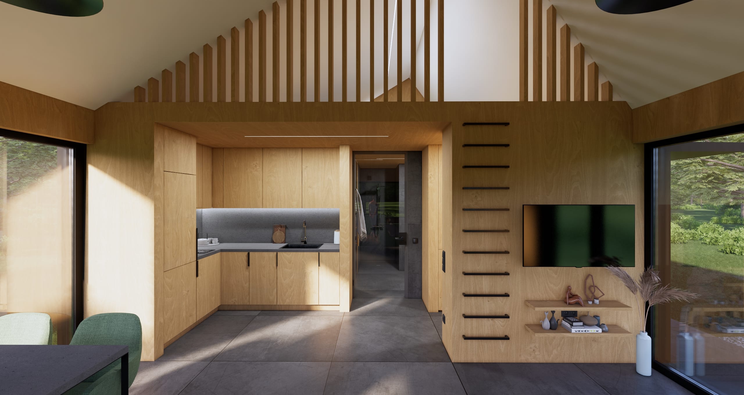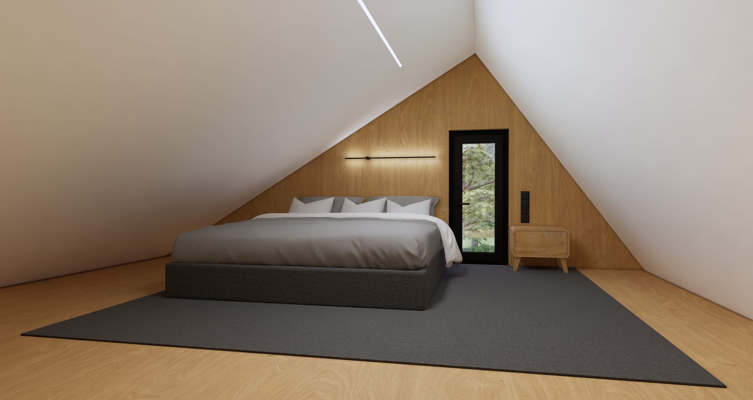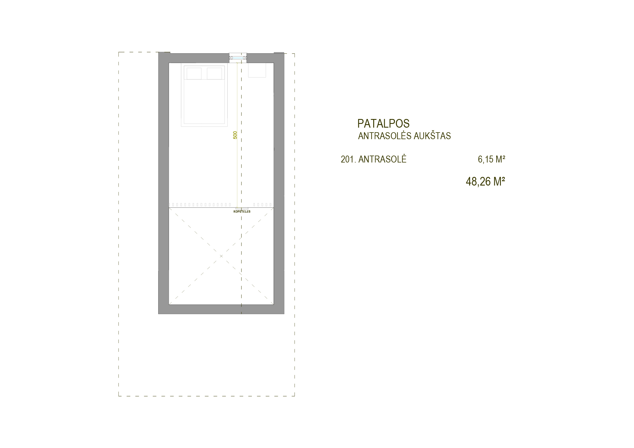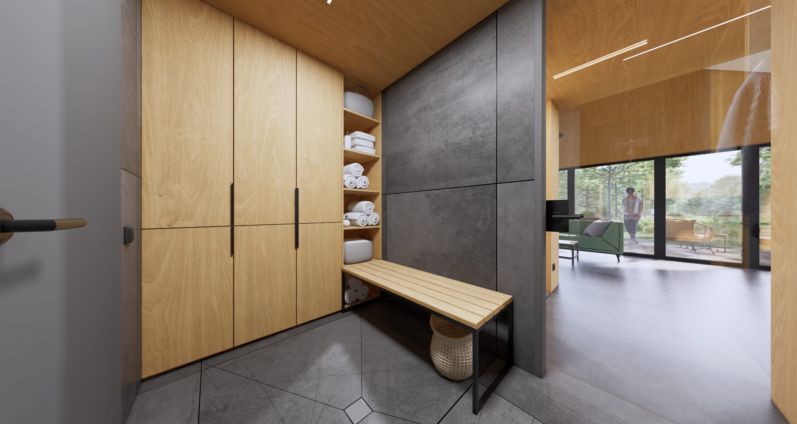 Modernus, kompaktiškas I gr. nesudėtingas statinys – karkasinė pirtis, vieno aukšto su antrasole, 48m2 bendro ploto su dvišlaičiu stogu. Numatytas funkcionalus išplanavimas: tambūras, priešpirtis, persirengimo patalpa su dušu, sanitarinis mazgas, pirties patalpa ir antrasolė. Prie pastato numatyta terasa su stogine, į kurią patenkama iš priešpirčio.