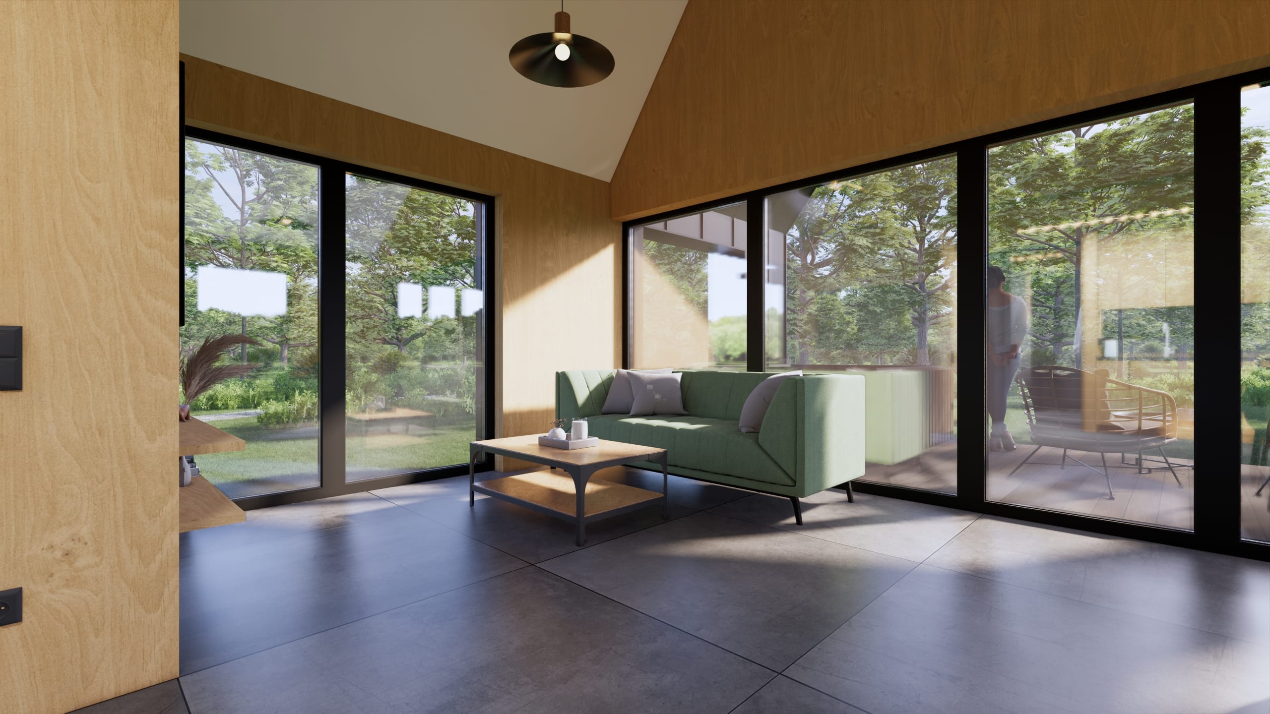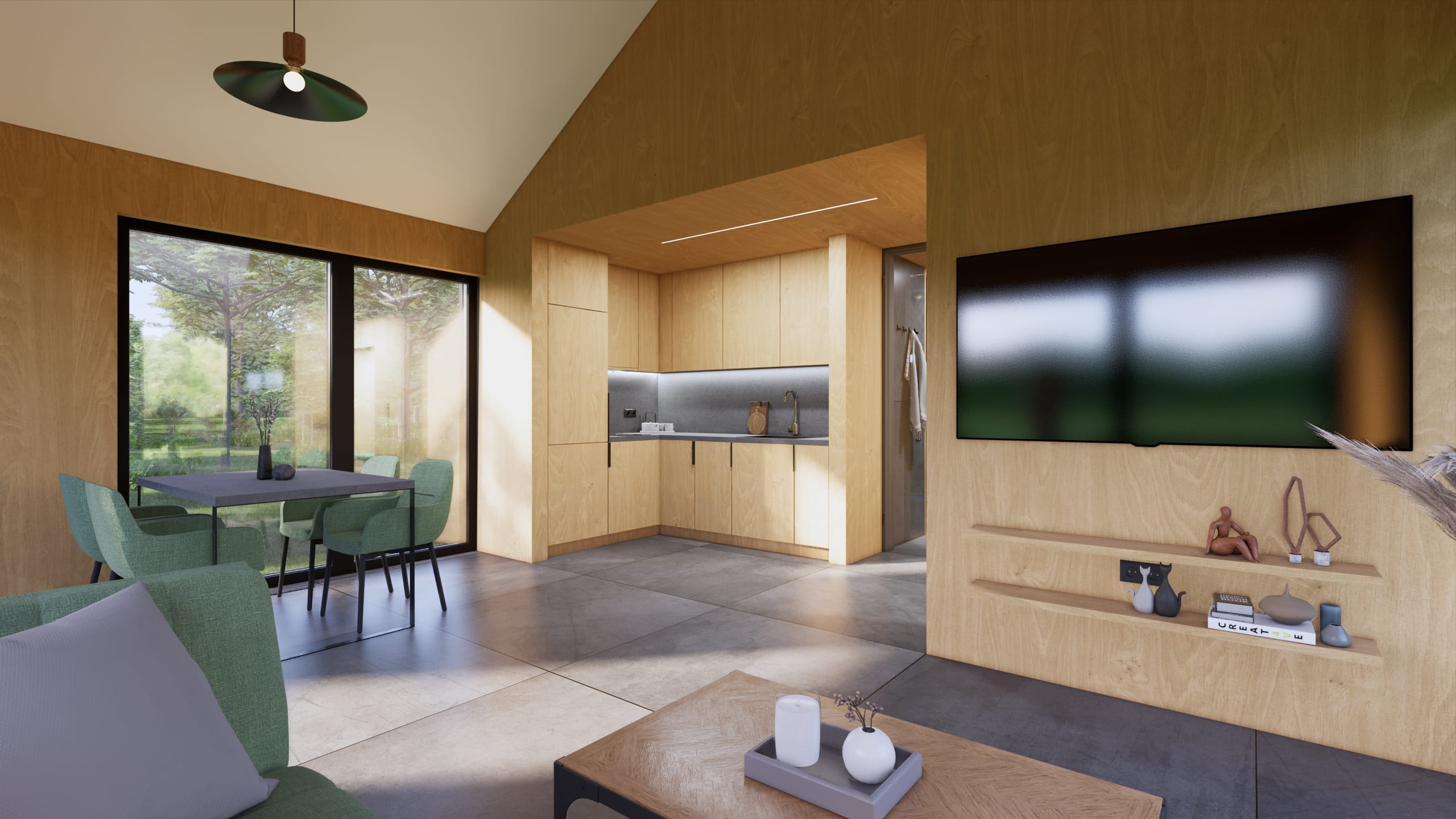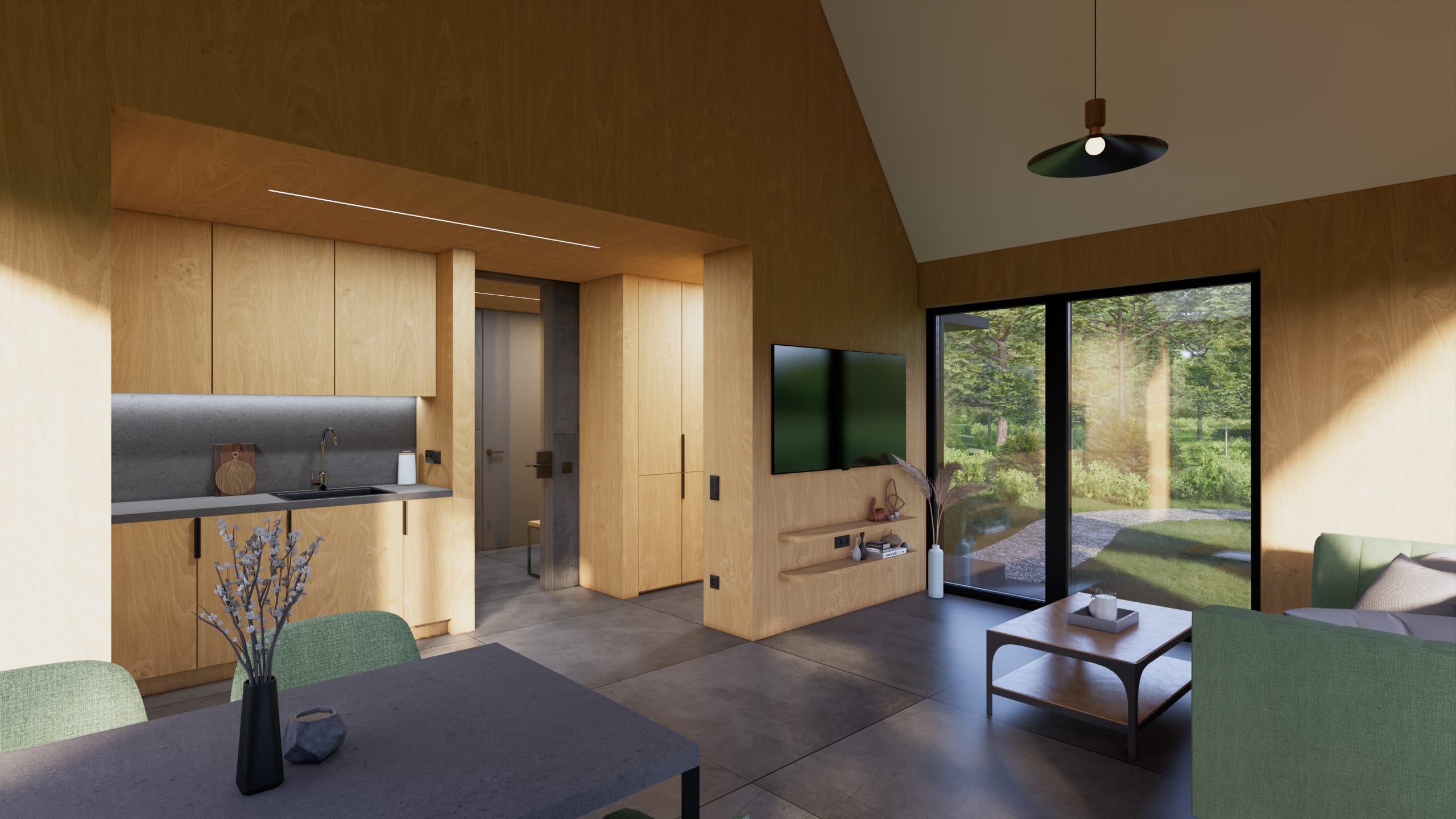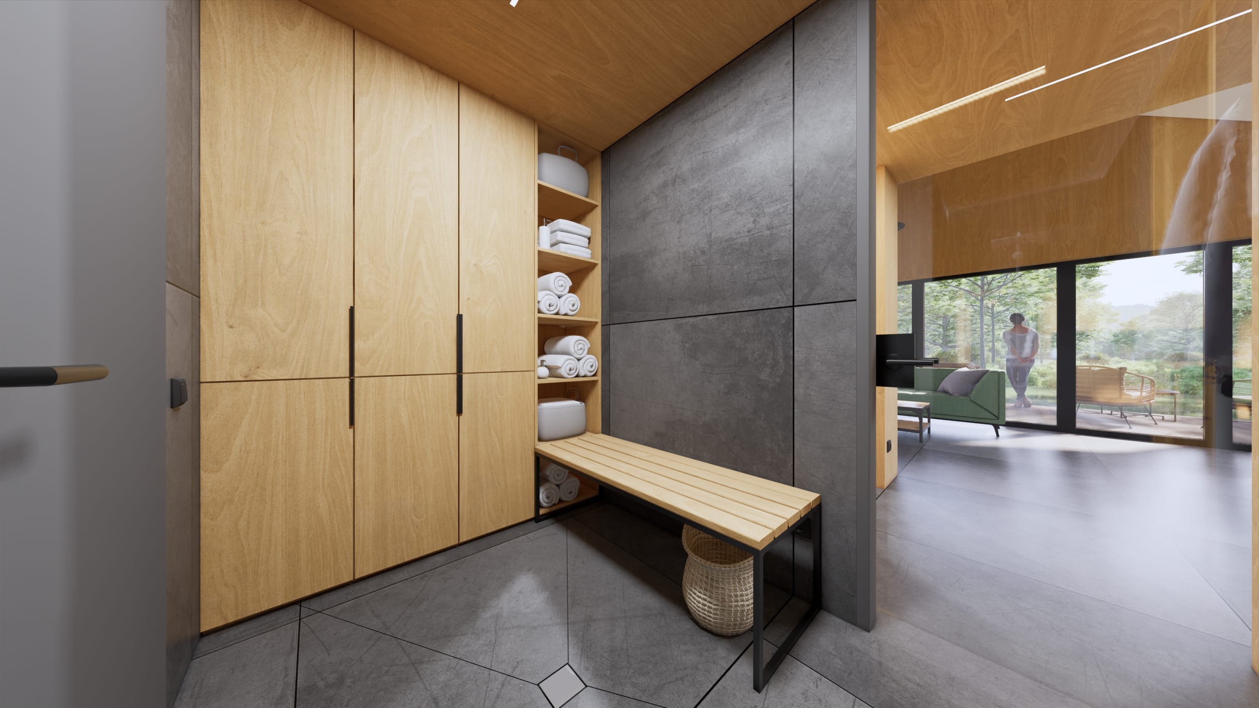 Modernus, kompaktiškas I gr. nesudėtingas statinys – karkasinė pirtis, vieno aukšto, 42m2 bendro ploto su dvišlaičiu stogu. Numatytas funkcionalus išplanavimas: tambūras, priešpirtis, persirengimo patalpa su dušu, sanitarinis mazgas ir pirties patalpa. Prie pastato numatyta terasa su stogine, į kurią patenkama iš priešpirčio.