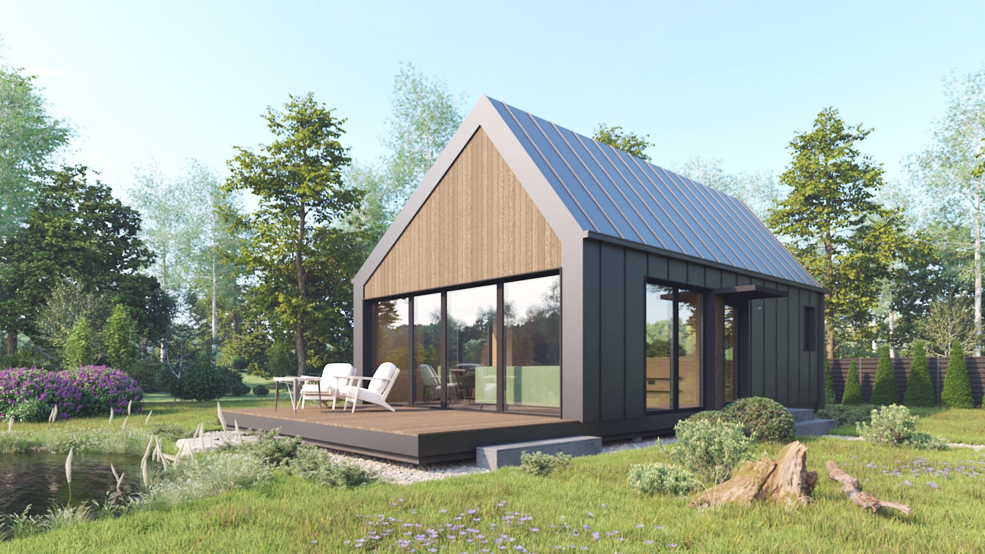 Modernus, kompaktiškas I gr. nesudėtingas statinys – karkasinė pirtis, vieno aukšto, 42m2 bendro ploto su dvišlaičiu stogu. Numatytas funkcionalus išplanavimas: tambūras, priešpirtis, persirengimo patalpa su dušu, sanitarinis mazgas ir pirties patalpa. Prie pastato numatyta terasa, į kurią patenkama iš priešpirčio.