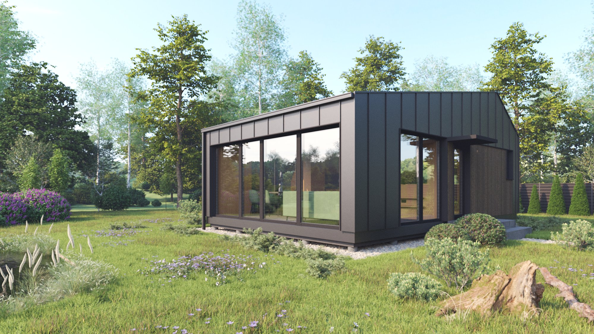 Modernus, kompaktiškas I gr. nesudėtingas statinys – karkasinė pirtis, vieno aukšto, 42m2 bendro ploto su dvišlaičiu stogu. Numatytas funkcionalus išplanavimas: tambūras, priešpirtis, persirengimo patalpa su dušu, sanitarinis mazgas ir pirties patalpa.