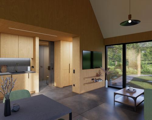 Modernus, kompaktiškas I gr. nesudėtingas statinys – karkasinė pirtis, vieno aukšto, 42m2 bendro ploto su dvišlaičiu stogu. Numatytas funkcionalus išplanavimas: tambūras, priešpirtis, persirengimo patalpa su dušu, sanitarinis mazgas ir pirties patalpa. Prie pastato numatyta terasa su stogine, į kurią patenkama iš priešpirčio.
