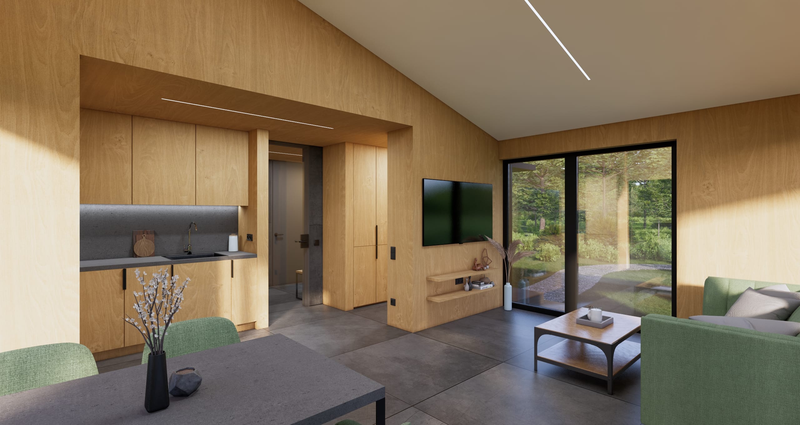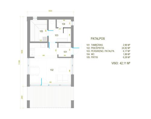 Modernus, kompaktiškas I gr. nesudėtingas statinys – karkasinė pirtis, vieno aukšto, 42m2 bendro ploto su vienšlaičiu stogu. Numatytas funkcionalus išplanavimas: tambūras, priešpirtis, persirengimo patalpa su dušu, sanitarinis mazgas ir pirties patalpa. Prie pastato numatyta terasa su stogine, į kurią patenkama iš priešpirčio.