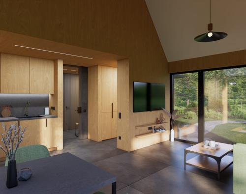 Modernus, kompaktiškas I gr. nesudėtingas statinys – karkasinė pirtis, vieno aukšto, 42m2 bendro ploto su dvišlaičiu stogu. Numatytas funkcionalus išplanavimas: tambūras, priešpirtis, persirengimo patalpa su dušu, sanitarinis mazgas ir pirties patalpa. Prie pastato numatyta terasa, į kurią patenkama iš priešpirčio.